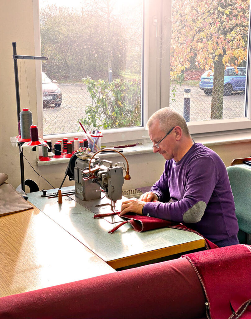 Gerade beim Leder gibt es ja große Unterschiede. Es kann stark vorbehandelt sein, also geschliffen oder gefärbt, oder eben naturbelassen. Es gibt besonders dickes, sogenanntes Neckleder, oder mit Mikrofaser beschichtetes Leder, oder Semianilinleder mit nur leichter Pigmentierung – die Auswahlpalette ist riesig! Je besser die Oberfläche des Leders ist, desto wertvoller ist es. Auch da beraten wir die Kunden gern ausführlich.