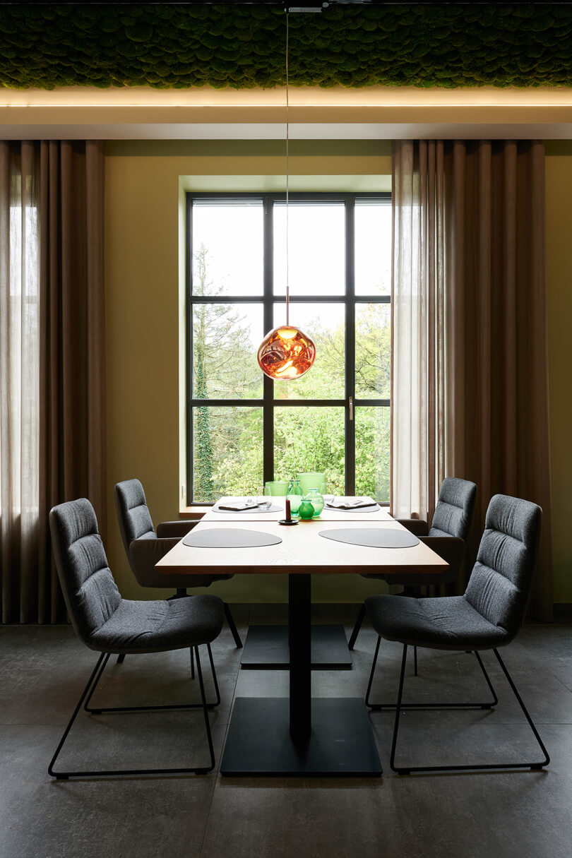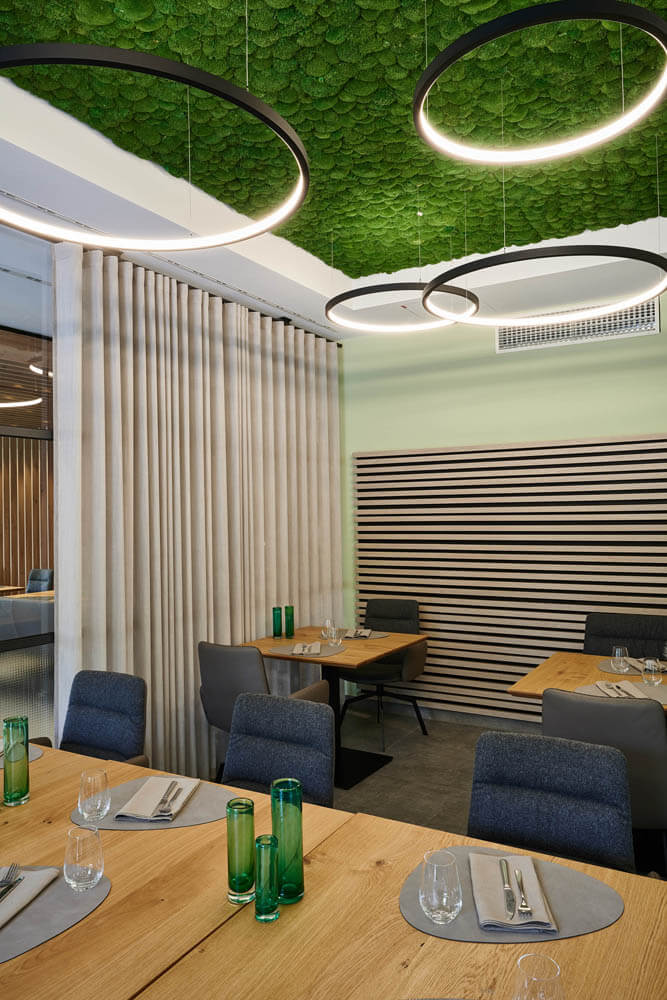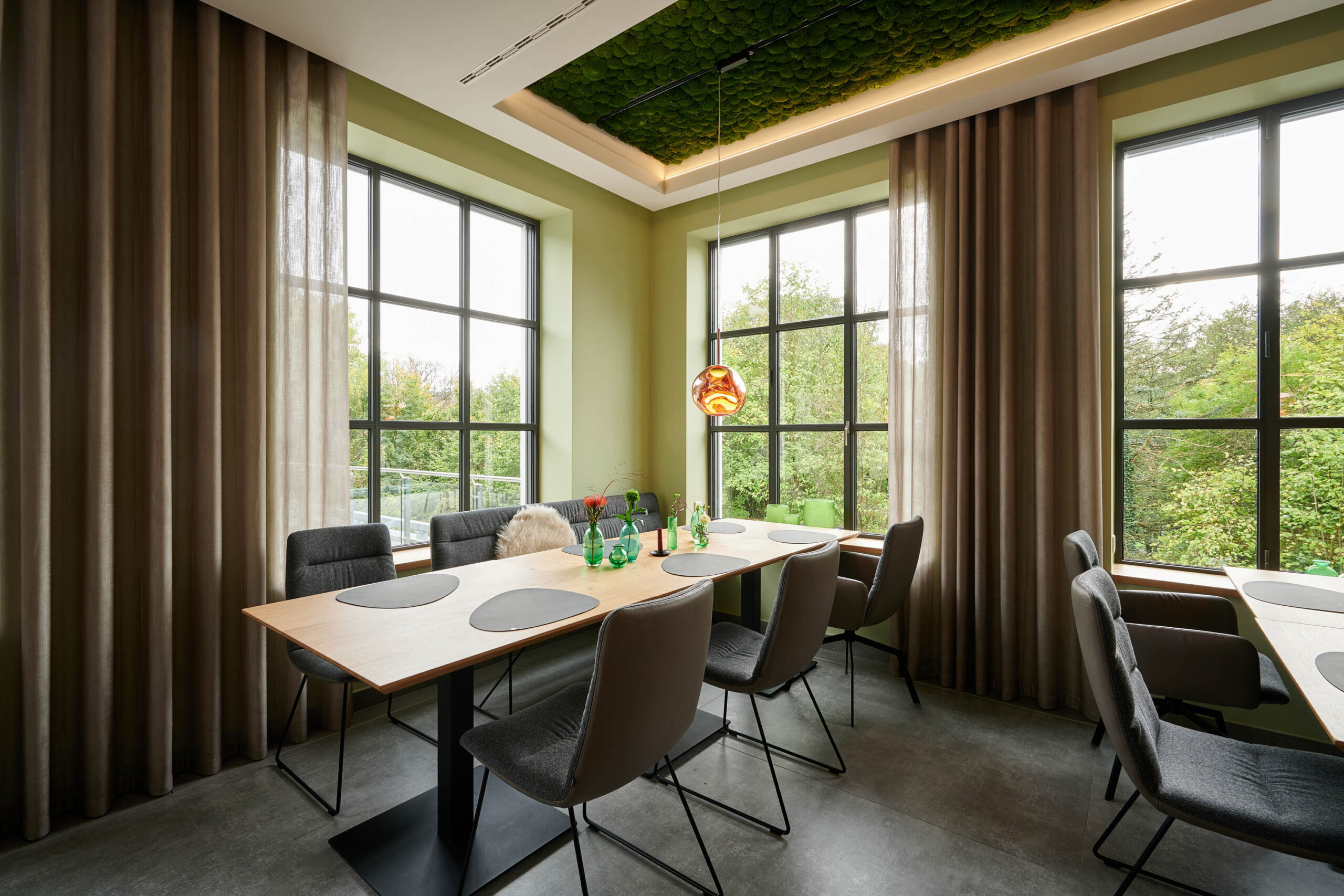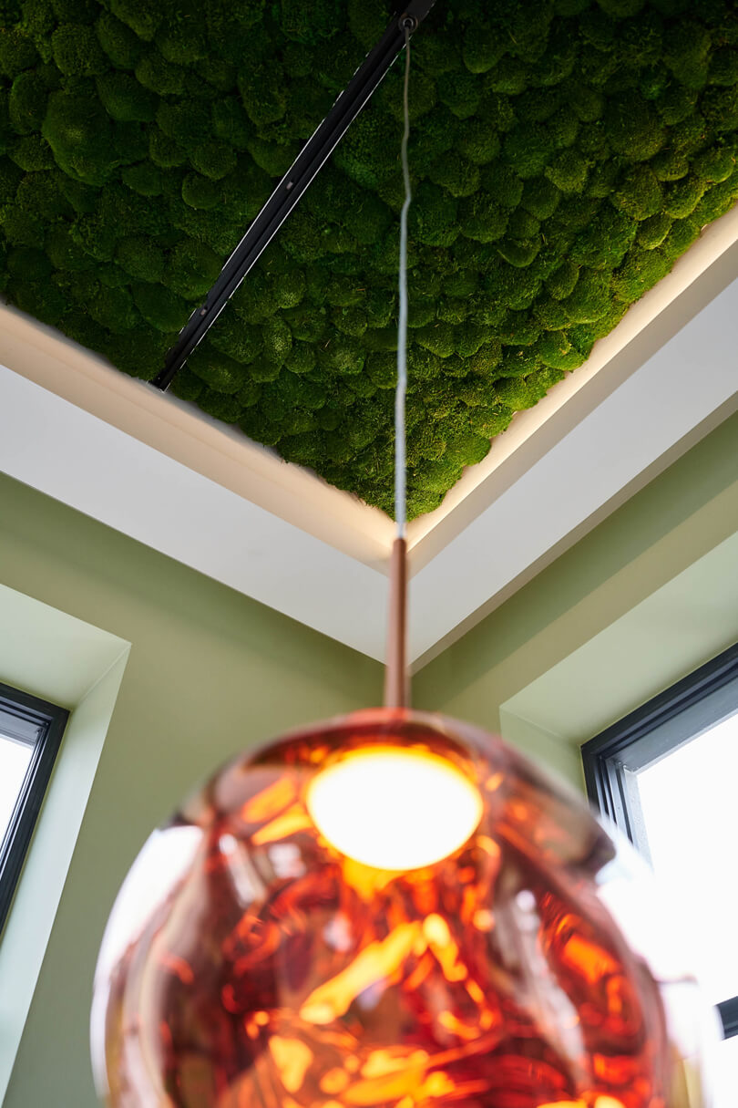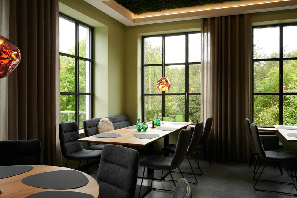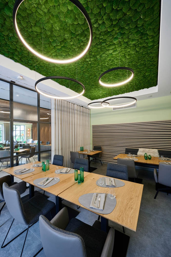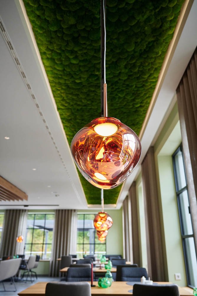 Ein leuchtend grünes Highlight ist die Moosdecke, die optisch den Bezug zur sauerländischen Natur schafft und dem Raum Behaglichkeit verleiht. Unterstützt wird dieser Nature Look durch die amorphen Leuchten von Tom Dixon über den Fenstertischen und an den Wänden.