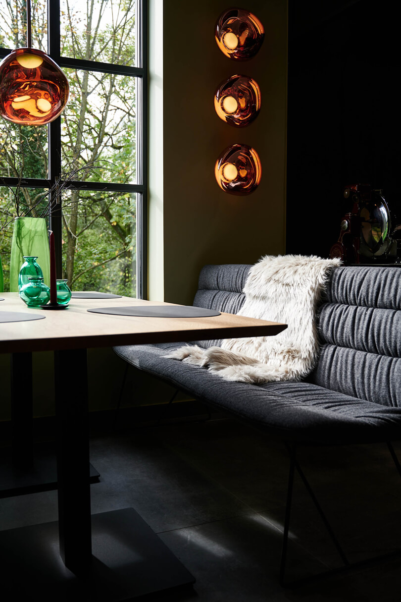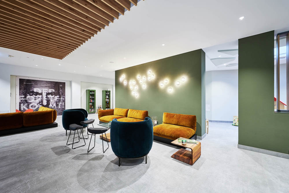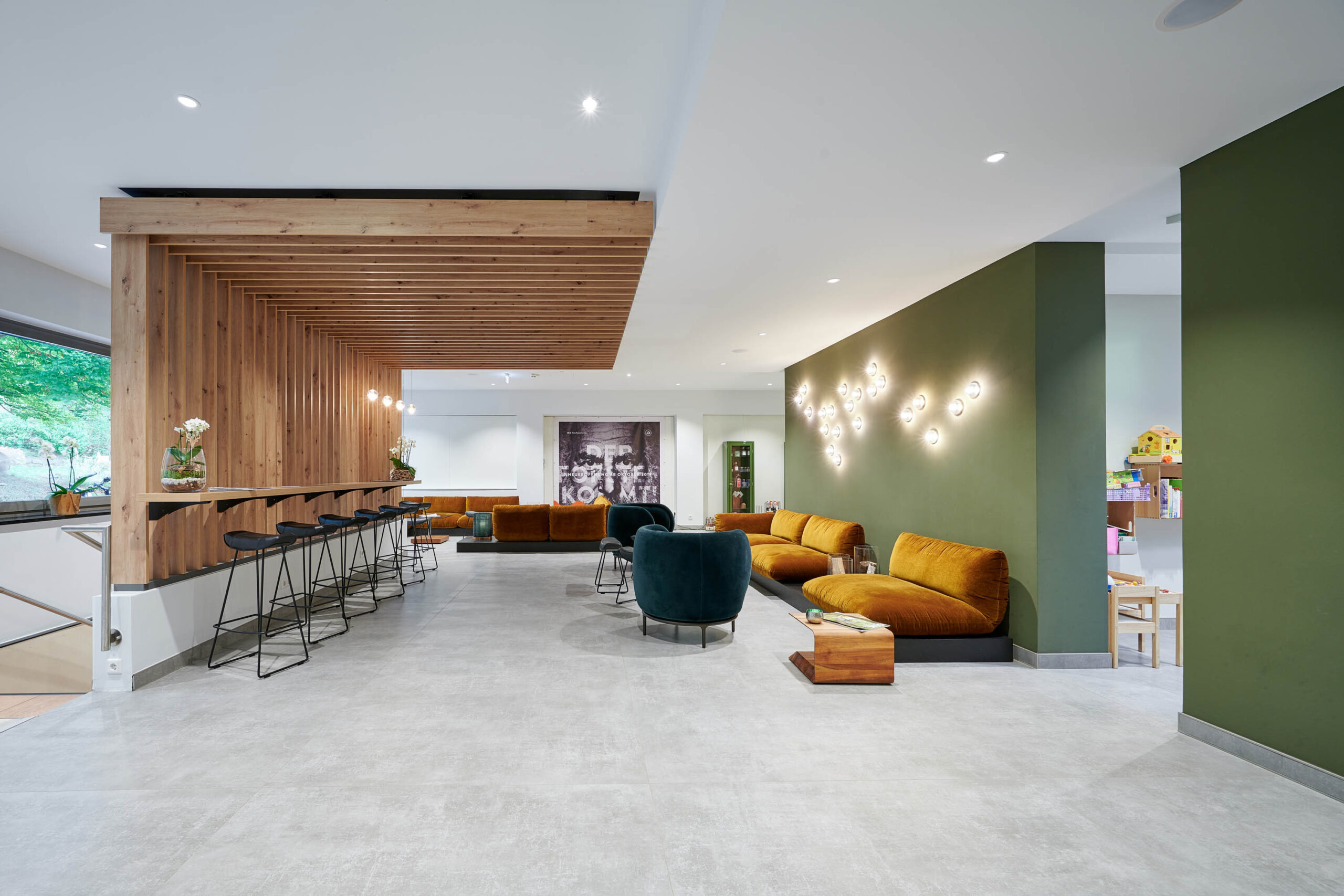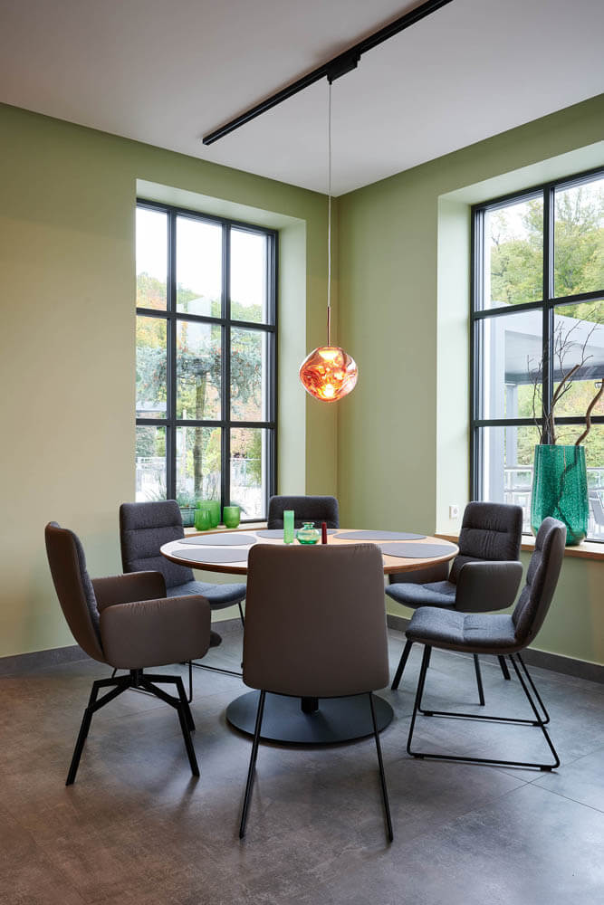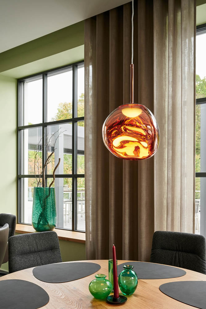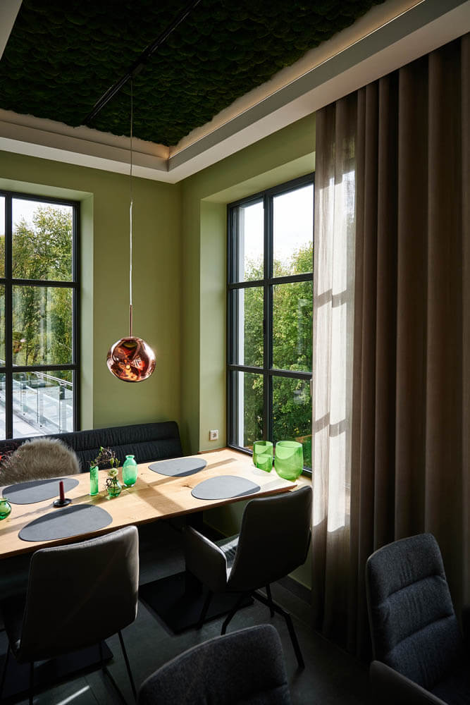 Ein leuchtend grünes Highlight ist die Moosdecke, die optisch den Bezug zur sauerländischen Natur schafft und dem Raum Behaglichkeit verleiht. Unterstützt wird dieser Nature Look durch die amorphen Leuchten von Tom Dixon über den Fenstertischen und an den Wänden.