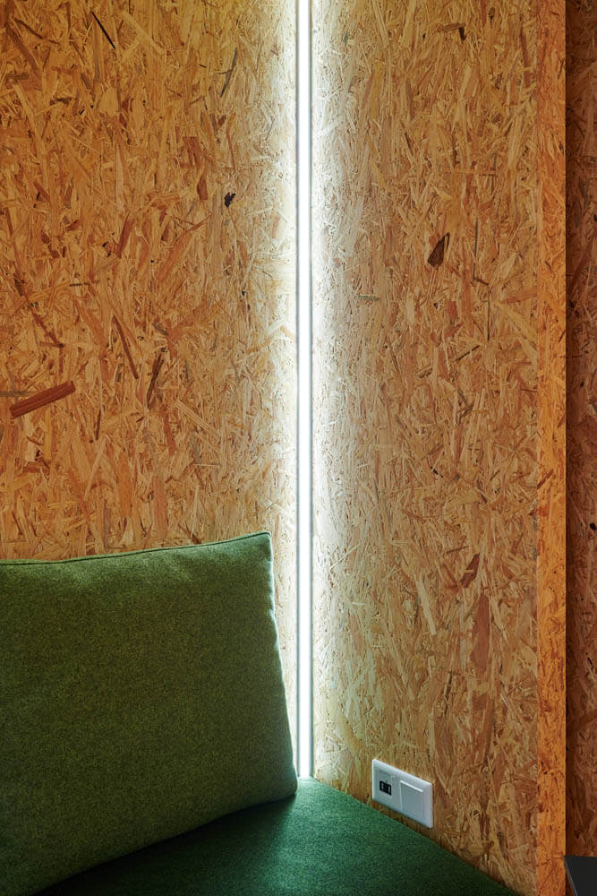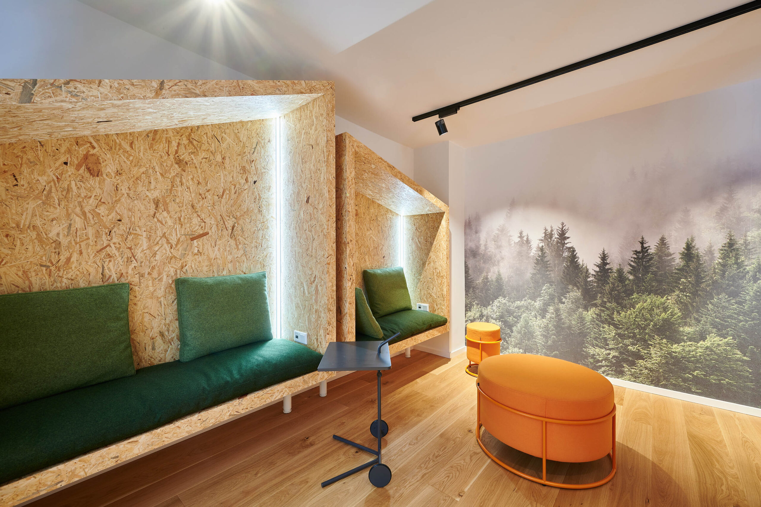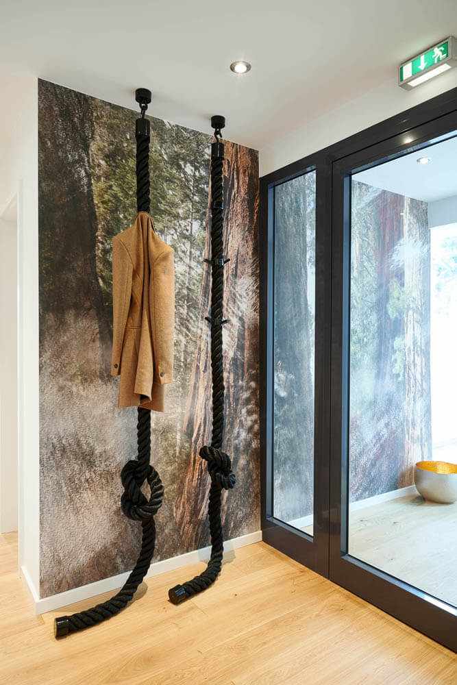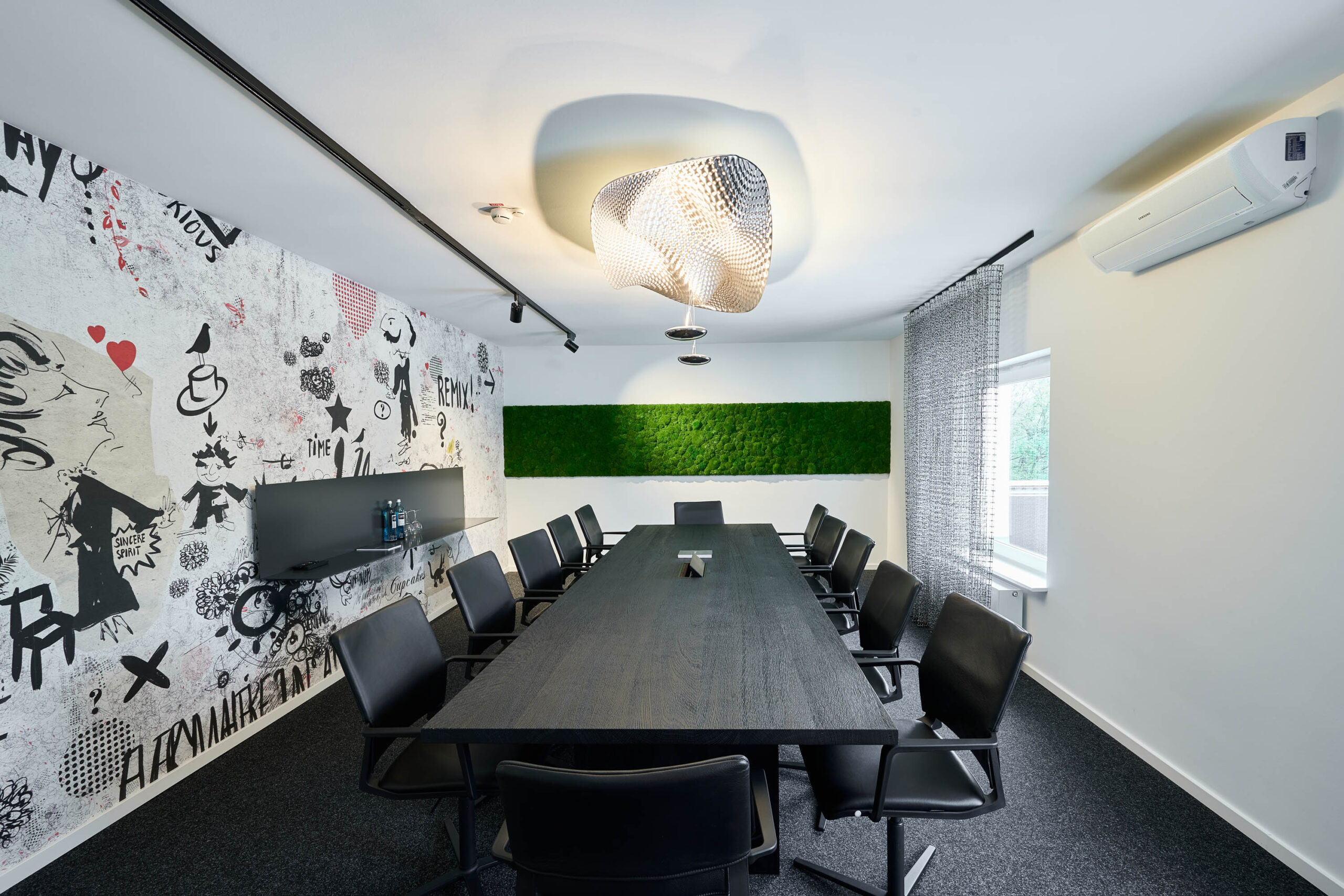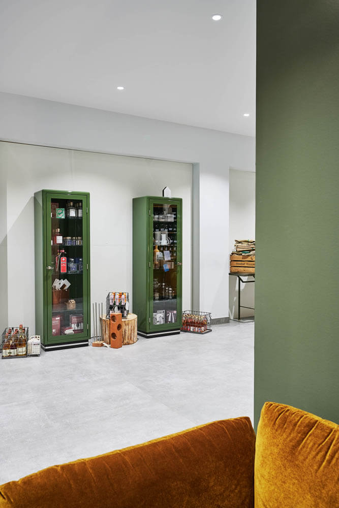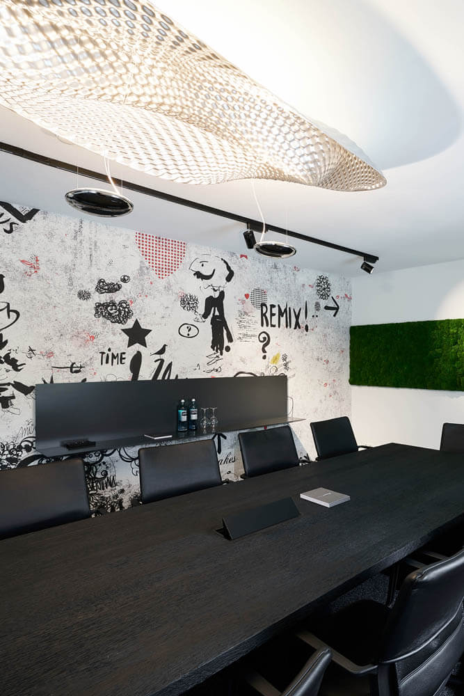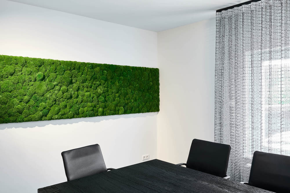 Ein leuchtend grünes Highlight ist die Moosdecke, die optisch den Bezug zur sauerländischen Natur schafft und dem Raum Behaglichkeit verleiht. Unterstützt wird dieser Nature Look durch die amorphen Leuchten von Tom Dixon über den Fenstertischen und an den Wänden.