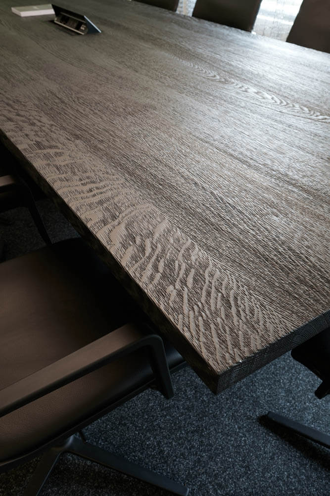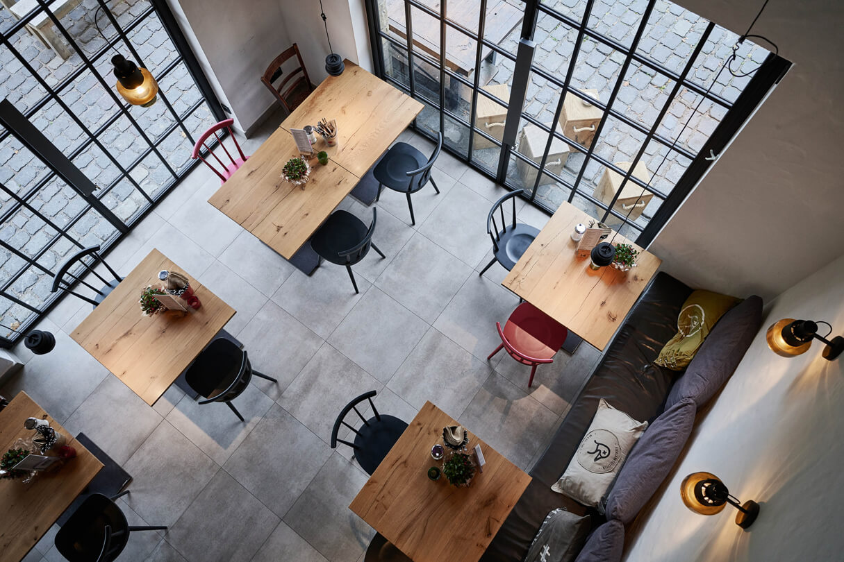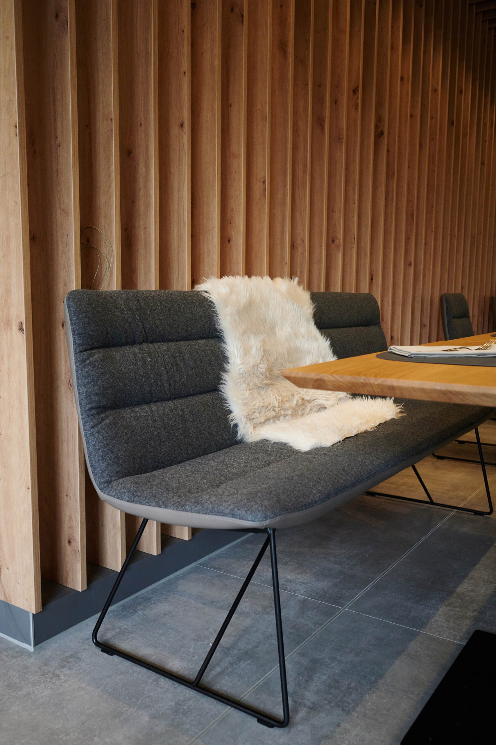 Die Tische aus Eiche sind als Sonderanfertigung über Scholtissek gefertigt, Bänke und Stühle von KFF, Ava light. Foto: interieur-hotel-fotografie
