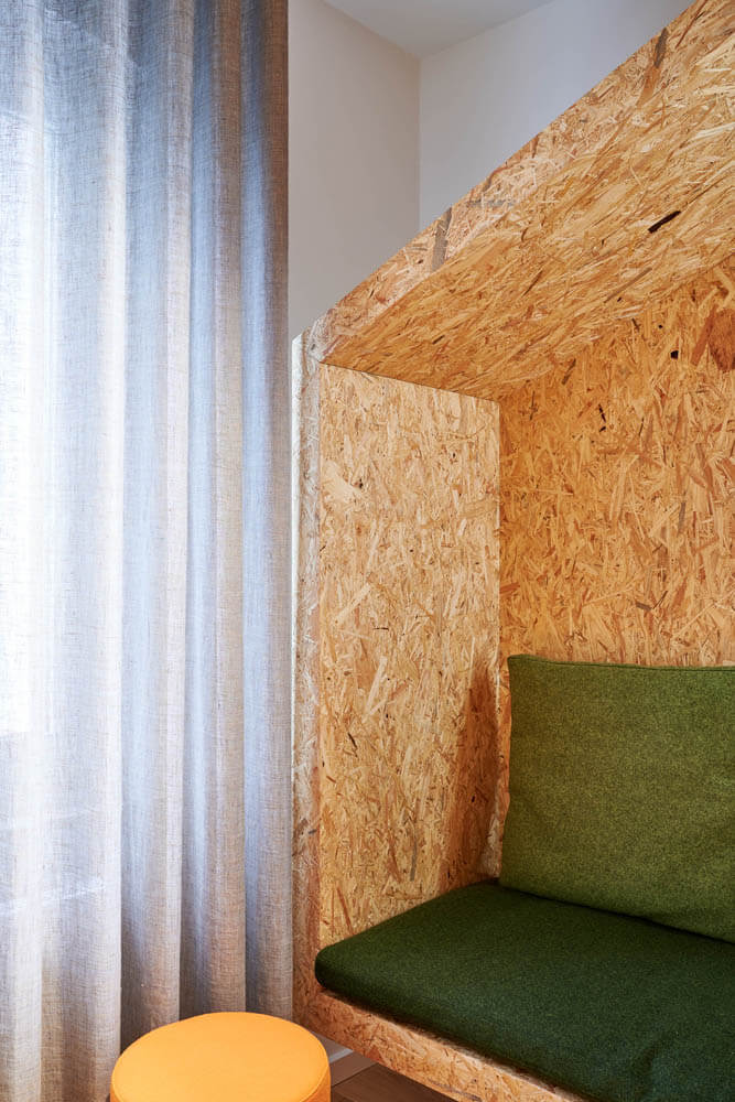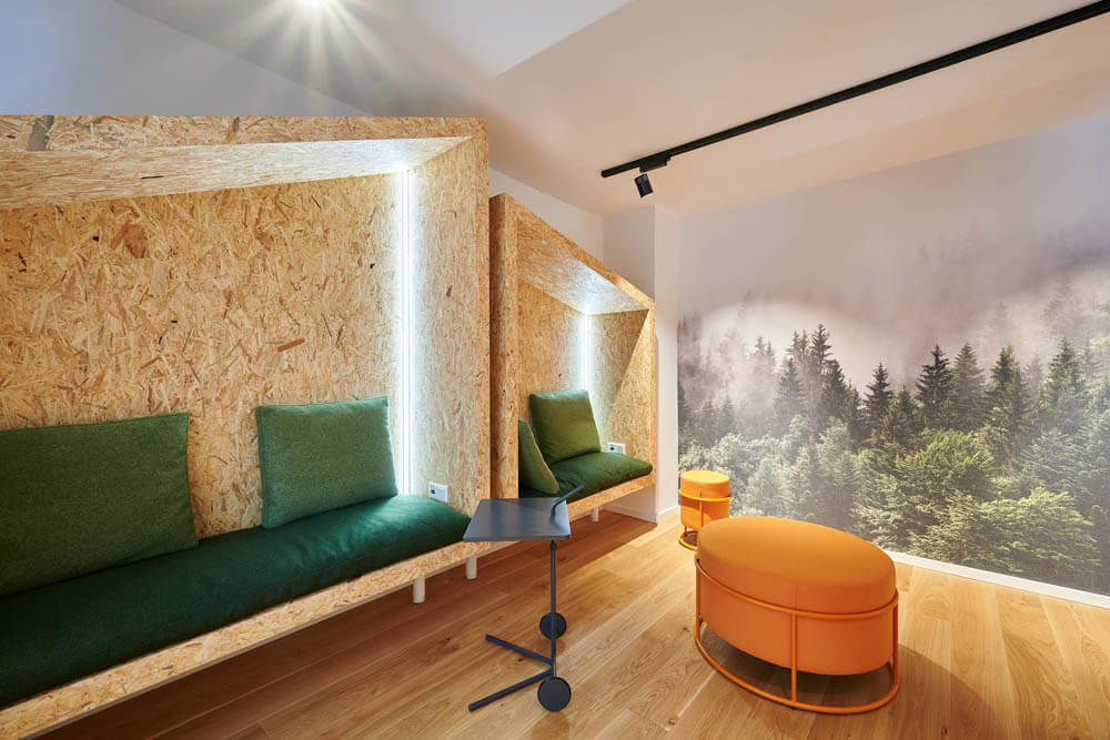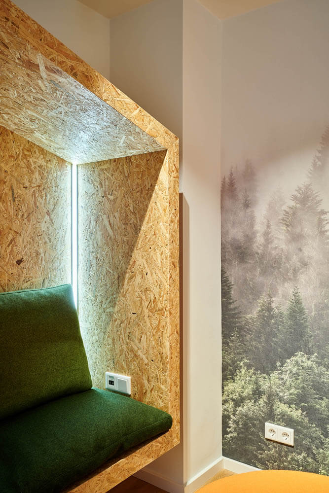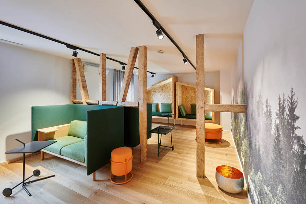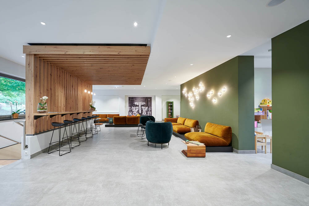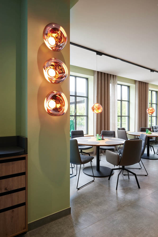 Auch in der Lobby zeigt sich die Stilsicherheit von raumideen. Verschiedene Zonen erfüllen die unterschiedlichen Bedürfnisse der Gäste. Ein langer Holztresen mit den praktischen Kya Reiter-Barstühlen von freifrau für den schnellen Cappuccino, gegenüber der Lounge-Bereich mit samtigen Jalis Polstern von COR in einem warmen Cognacton, die auf speziell dafür angefertigten dunklen Eichenpodesten liegen. An der oliv gestrichenen Wand sowie über dem Holztresen verbreiten mundgeblasene Glaskugeln aus der kanadischen Manufaktur Bocci heimeliges Licht und schaffen eine gelungene optische Verbindung zwischen Lounge- und Tresenbereich. „Eine Einrichtung, die insgesamt aus einem Guss ist, ohne eintönig zu wirken“, so Christoph Oberste. „Und selbstverständlich ist die komplette Ausstattung objektgeeignet, entspricht also allen gesetzlichen Anforderungen an Gebäudeeinrichtung.“