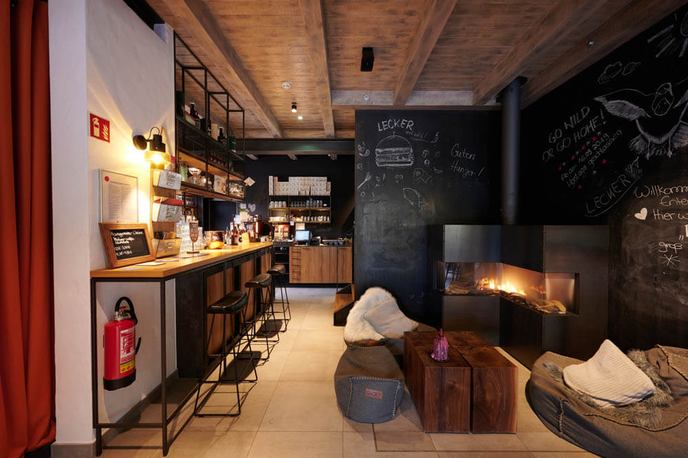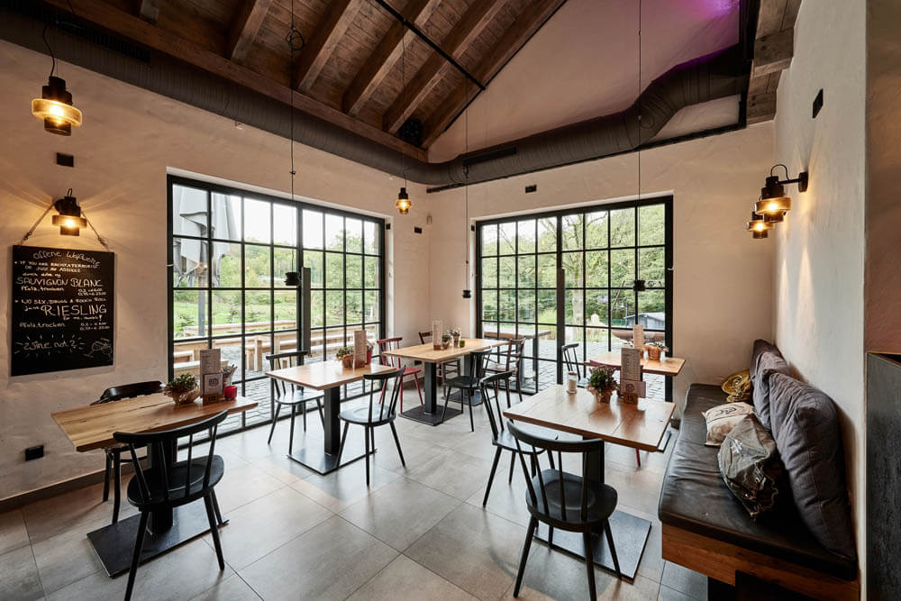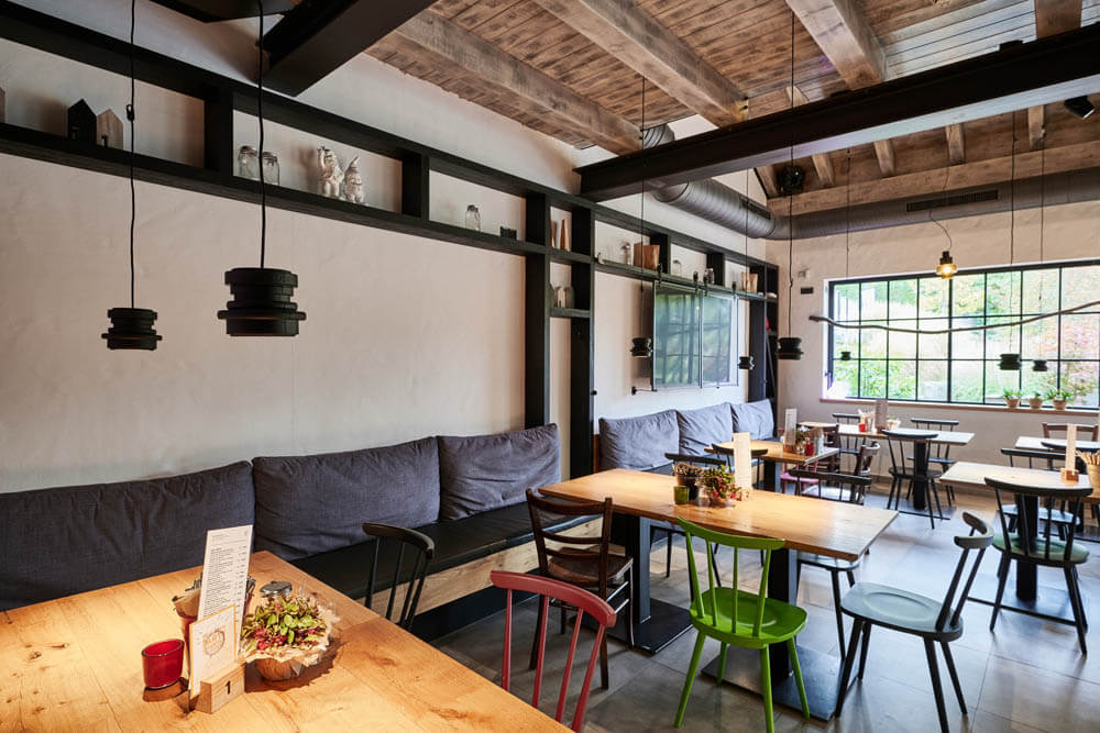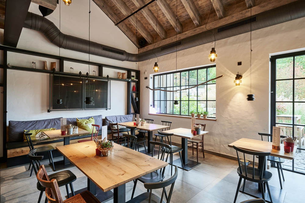 Im „Fetten Förster“ geht’s etwas gediegener zu. Von der offenen Küche aus schweift der Blick durch einen weiten, überwiegend mit Naturmaterialien und -tönen ausgestatteten Raum. Die umlaufende Fensterfront erhielt Vorhänge aus Halbleinen und wurde mit maßgefertigten Brüstungen aus gewachster massiver Eiche versehen, die sich auch in den Tischplatten wiederfindet. Gepolsterte Bänke und Stühle von KFF strahlen Leichtigkeit und Bequemlichkeit zugleich aus. Genau das Richtige für einen Abend mit gutem Essen und inspirierenden Gesprächen!