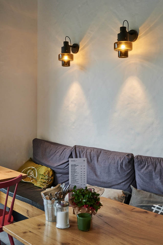 Die Polsterungen auf den einladenen Bänken wurden in der raumideen Werkstatt angefertigt. Die schwarzen Foscarini Leuchten aus der Diesel Kollektion schaffen ein gemütliches Licht auf den Tischen.