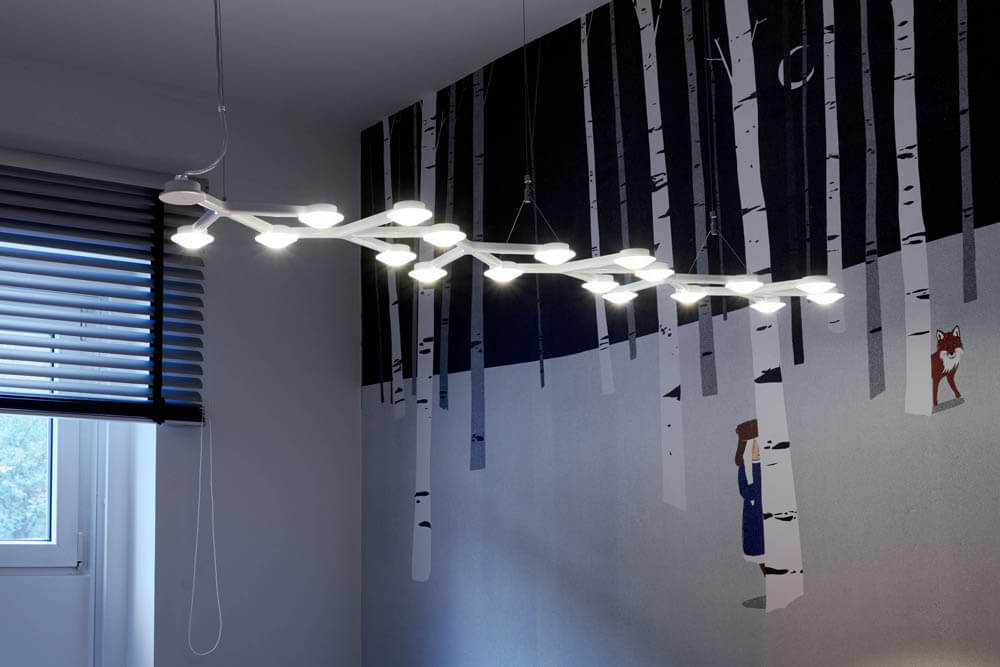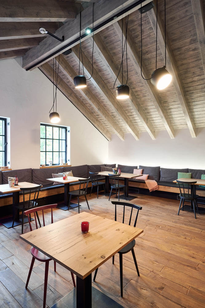 Im Dachstuhl in der oberen Etage der Wilden Ente wurde die AIM Leuchte von Flos installiert.