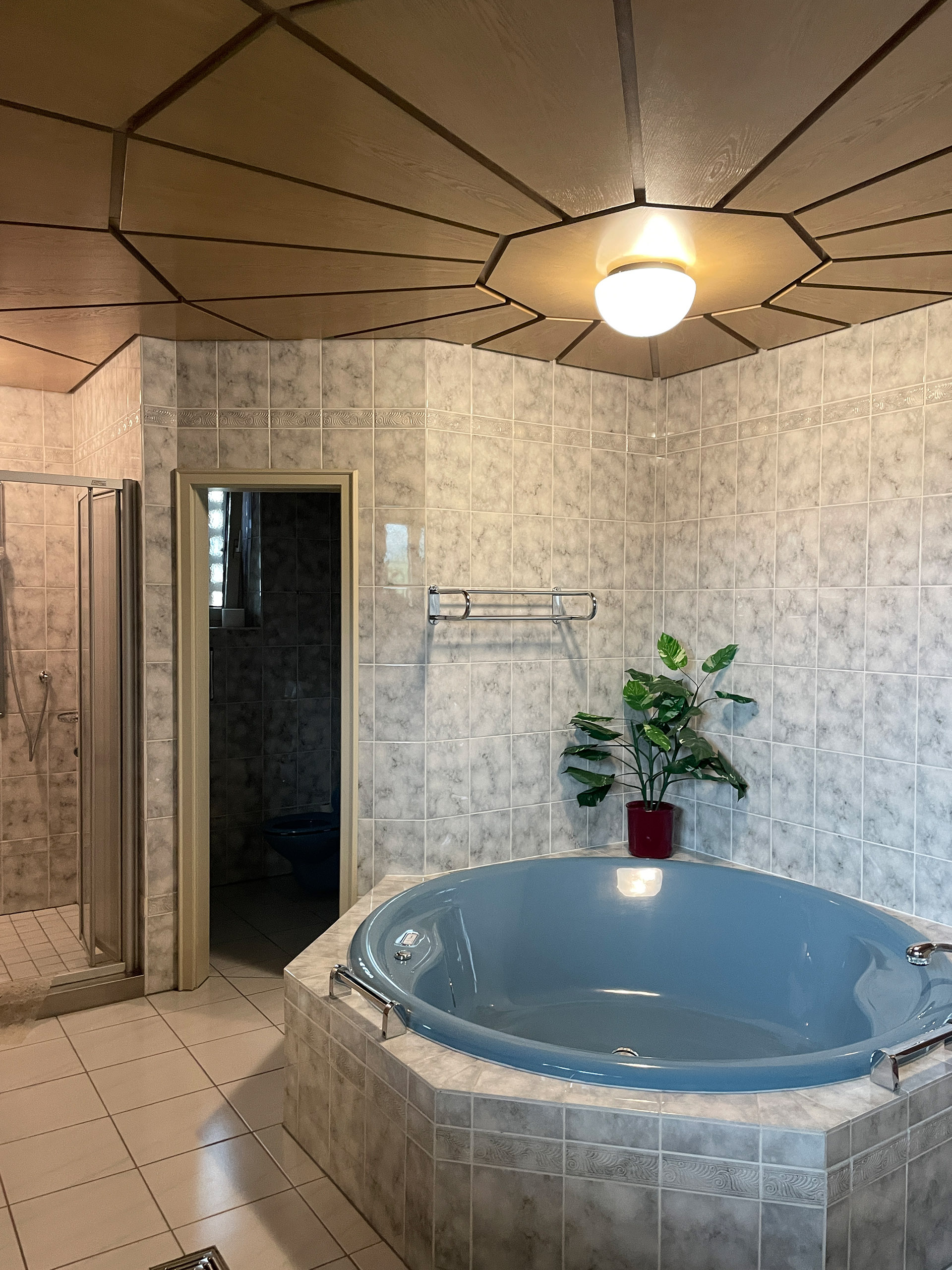 Wie im Urlaub fühlen sich Übernachtungsgäste bei der tollen Aussicht auf die Hügel des Sauerlandes. Nach einer entspannten Nacht in diesem gemütlichen Ruché Bett von Ligne Roset können sie sich im komplett neu gestalteten Gästebad erfrischen und ausgeruht in den neuen Tag starten.