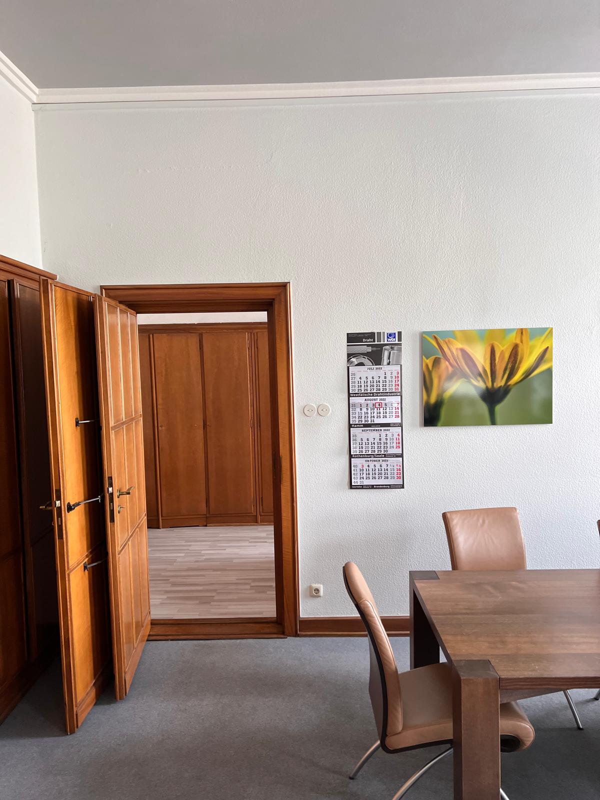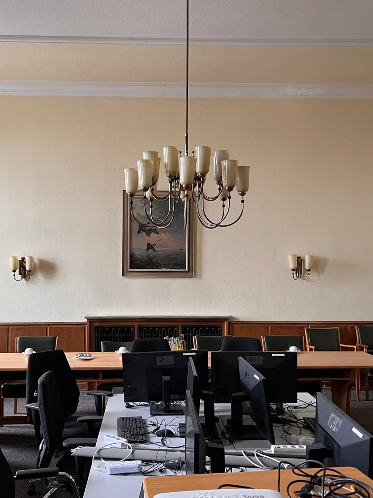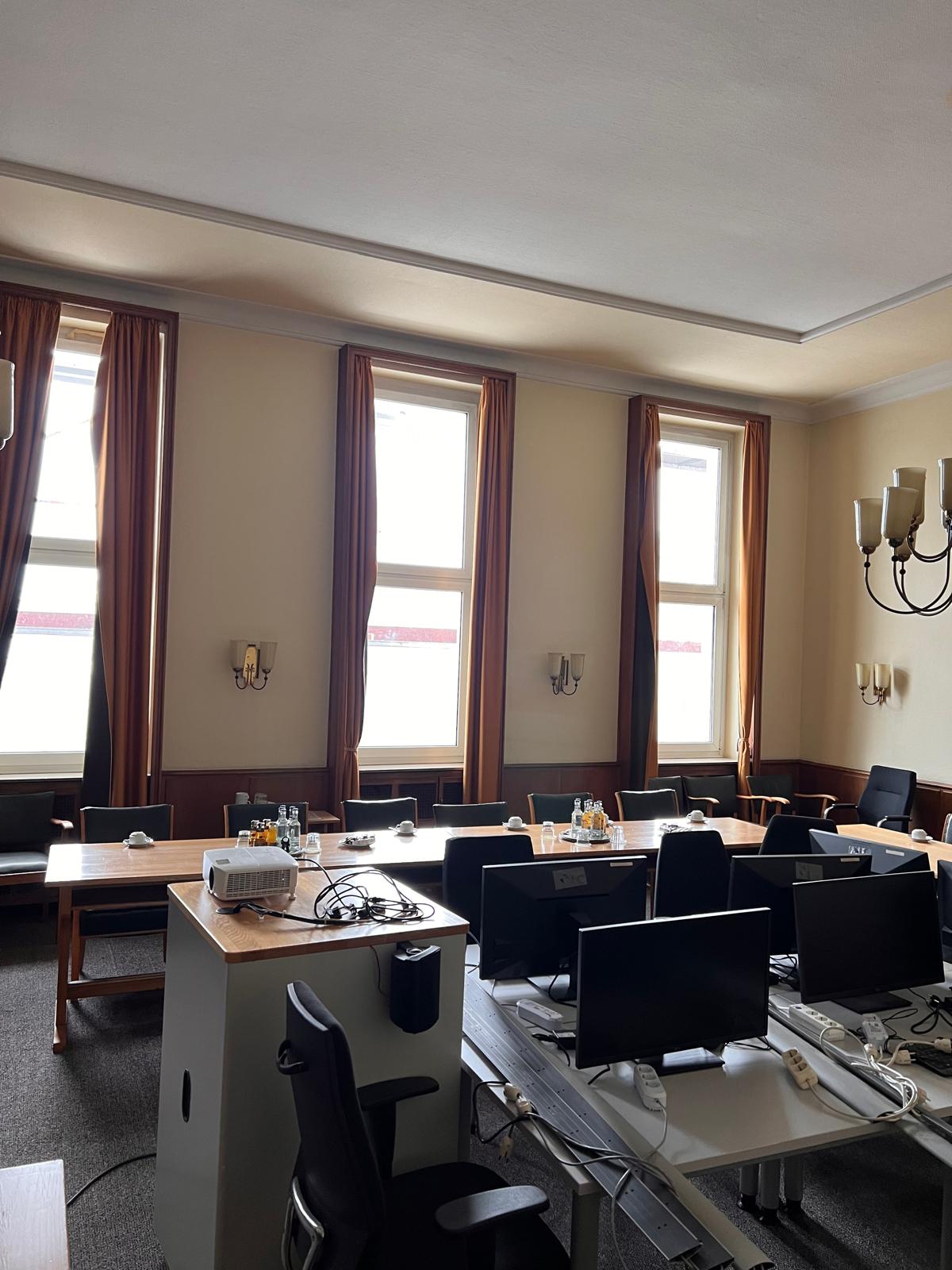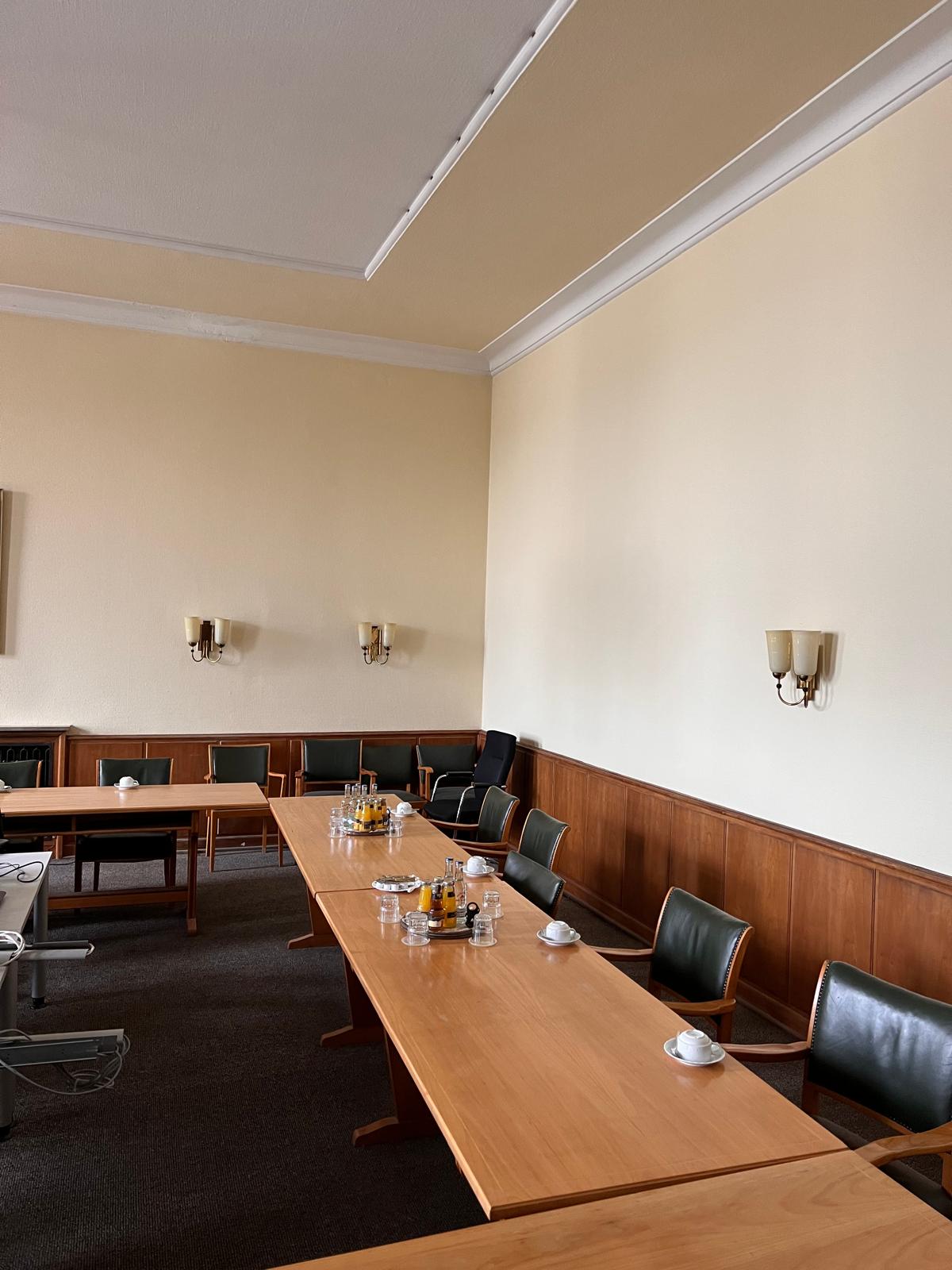 Hinter einer großen Flügeltür liegt der weitläufige Konferenzraum mit seinen etwa 4 Meter hohen Decken.