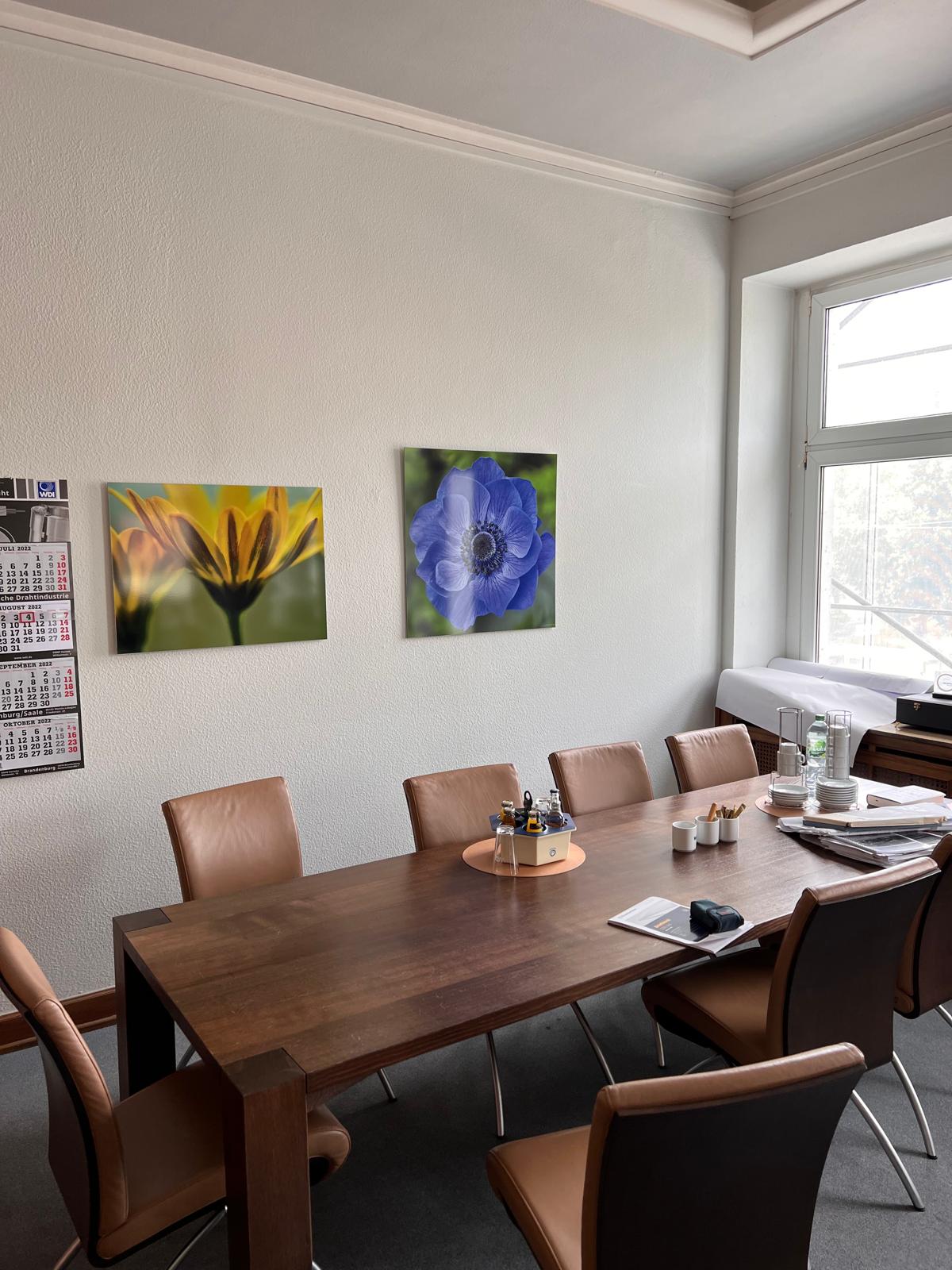 Auch das Büro der Geschäftsführerin atmet Geschichte. Fotos von Produkten des Unternehmens und Highlights seiner erfolgreichen Historie zieren die große Wand hinter dem ausladenden Schreibtisch von Walter Knoll.