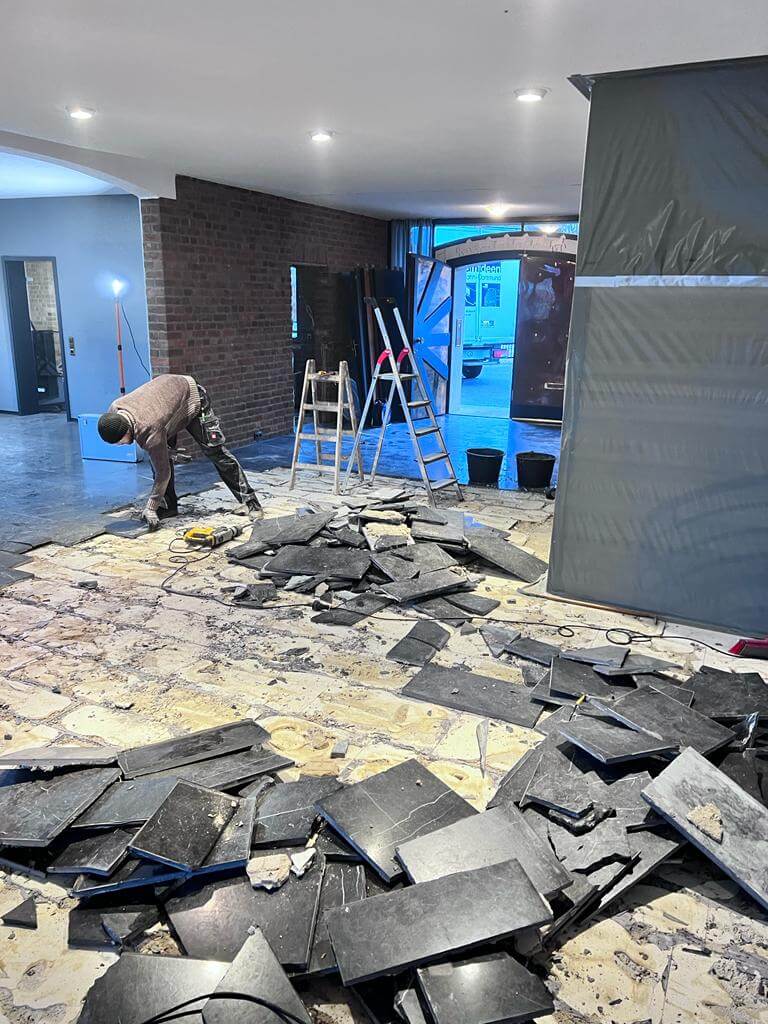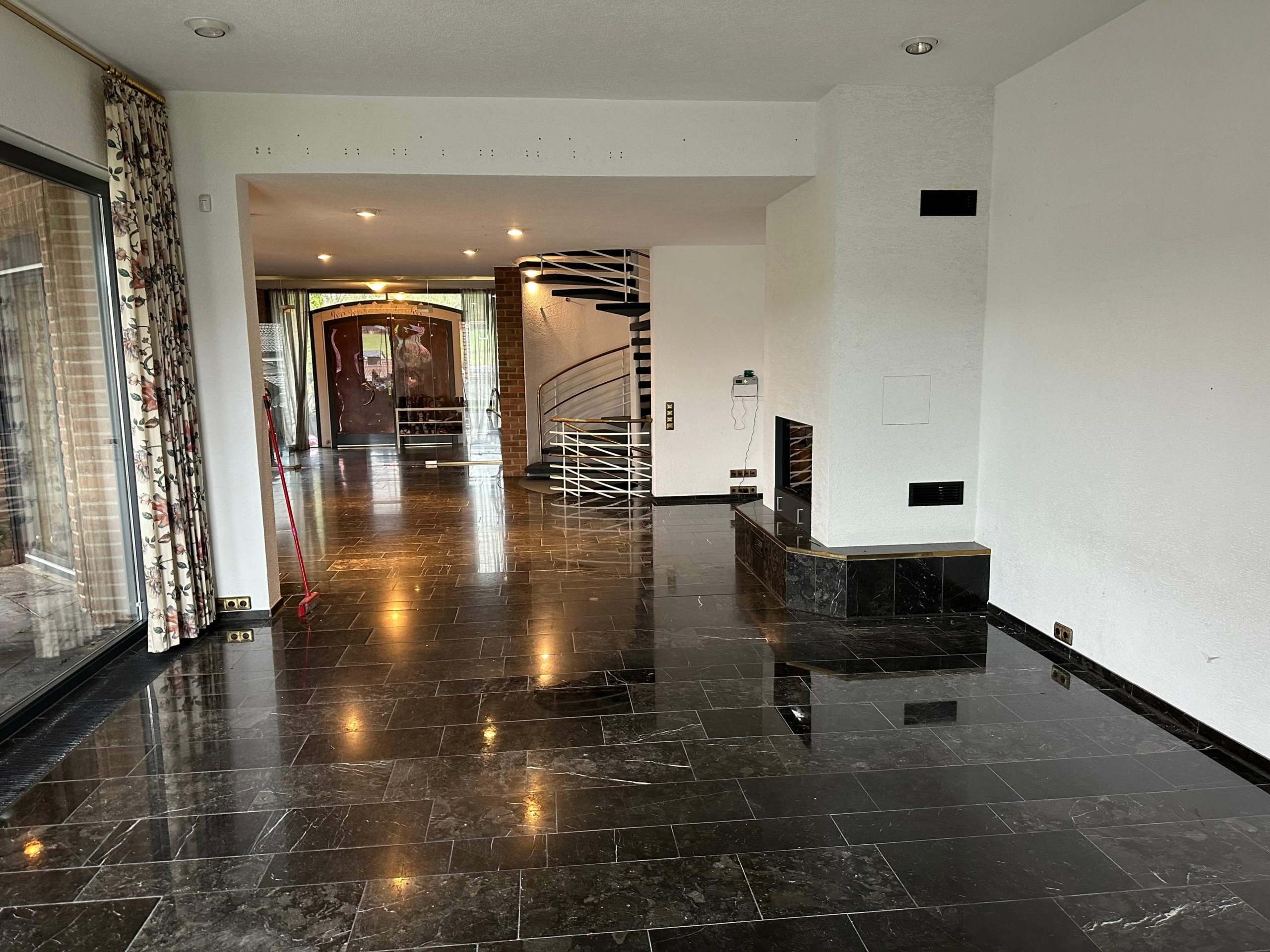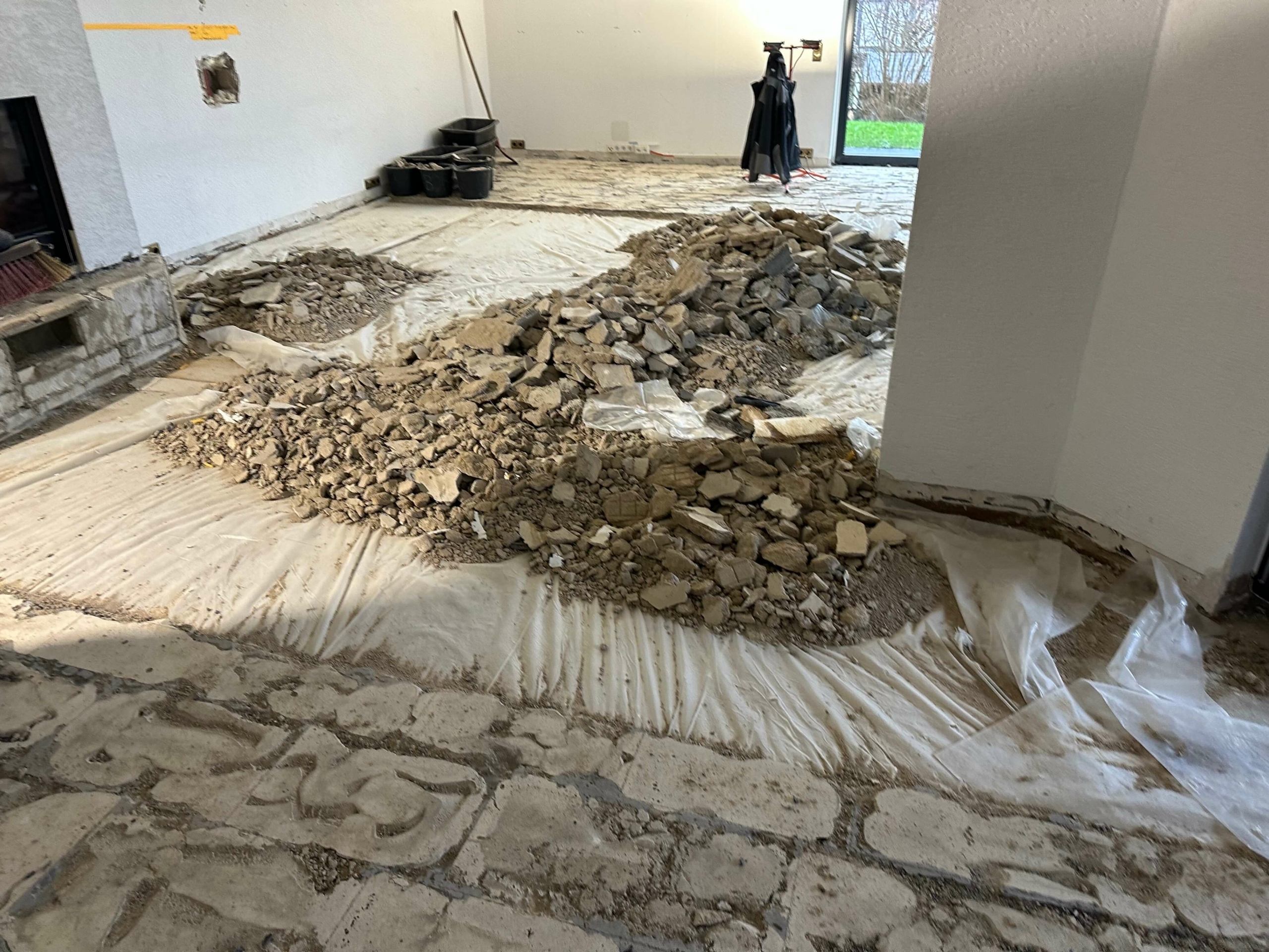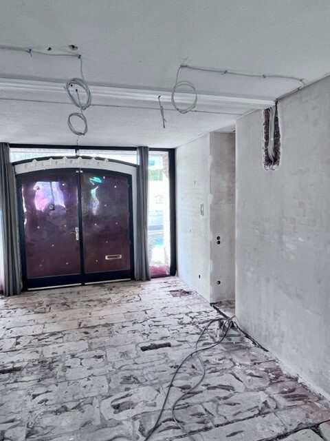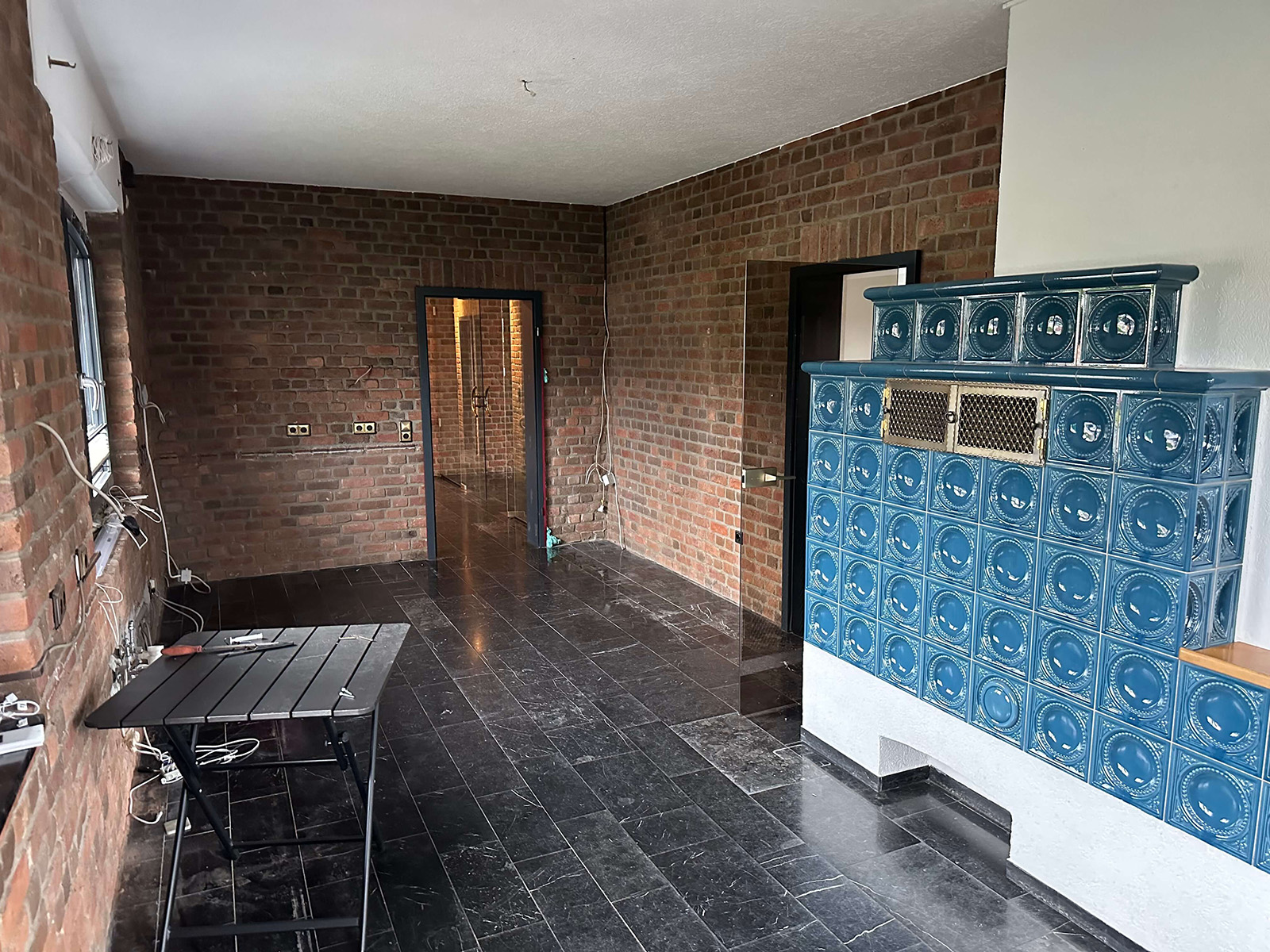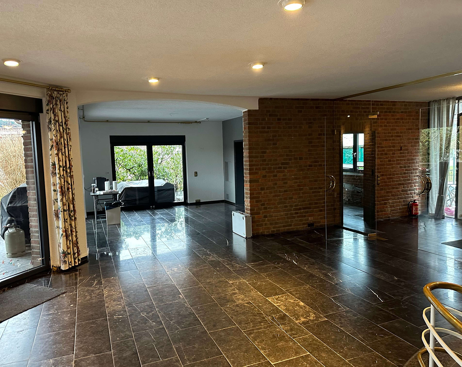 Begleiten Sie uns auf einem Rundgang durch das frisch fertiggestellte Projekt! Wir starten im Eingangsbereich. Er wurde – wie das gesamte Erdgeschoss – komplett entkernt. Der alte Estrich wurde entfernt, der Boden neu aufgebaut und von einem raumideen-Systempartner flächendeckend mit extragroßen Fliesen belegt.
