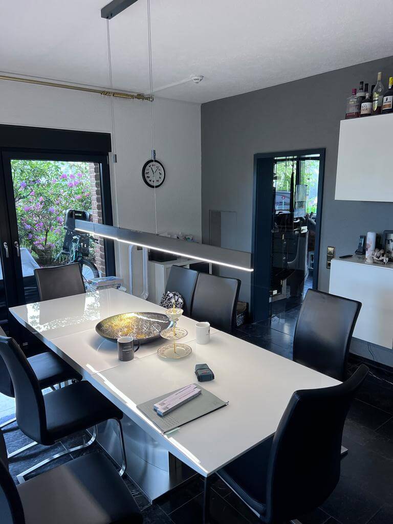 Mit vielen lieben Gästen an einer langen Tafel sitzen – wer will das nicht? Die Besitzer sind überglücklich, dass die Trennwand zwischen Küche und Esszimmer nun Geschichte ist. Statisch war das nicht ganz einfach, aber dank eines großen Stahlträgers ist es nun kein Problem mehr. Um Einheitlichkeit in den Raum zu bringen, erhielt die Kochinsel dieselbe Oberflächenbeschaffenheit wie der Esstisch: erstklassige Keramik.