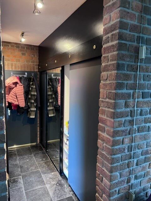 Die raumideen-Schreinerei umbaute an dieser Stelle einen Sicherungskasten mit maßgefertigten Regalelementen für zusätzlichen Stauraum und setzte große Spiegeltüren als elegante und nützliche Verkleidung davor.